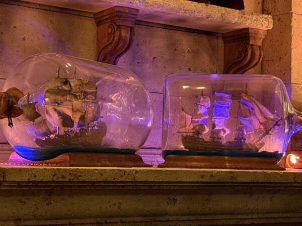 Captain’s Quarters – Once home to a Spanish commander, the space still displays tattered finery. Every few minutes, ship models in glass bottles magically battle on the mantel.