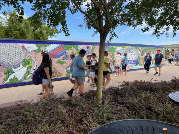 New Mural Installed At EPCOT: As part of the Disney100 celebration, EPCOT has installed a new mural featuring 100 Disney characters. The mural is located on the pathway connecting the Imagination Pavilion to World Showcase.