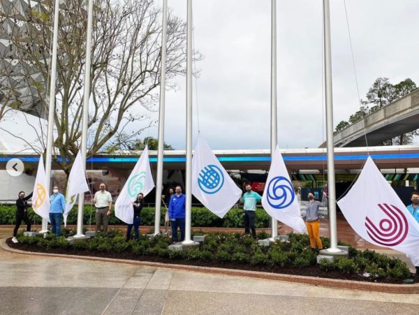 Disney Imagineer Zach Riddles shared photos on his Instagram account of Cast Members raising the flags representing the pavilions of EPCOT on newly installed flag poles near the entrance to Spaceship Earth in EPCOT.
