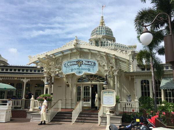 Crystal Palace is located inside the Magic Kingdom. If you head down Main Street towards Cinderella Castle, you’re going to want to stay to the left side. Once you pass Casey’s Corner, take that sharp left towards the area where you find the bathrooms and First Aid. The Crystal Palace is that gorgeous white building with a glass greenhouse roof. Impossible to miss!