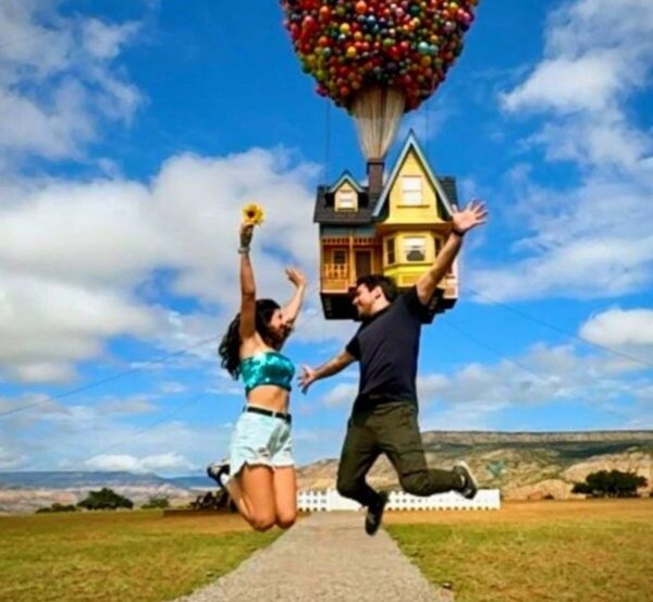 While staying at the magical property, Lua and Heitor connected with the natural wonders surrounding the Up House in New Mexico, including hiking, canoeing, and a sunset picnic in the canyons. While the couple was inside the house working on their own Adventure Book photo album, just like Carl and Ellie’s in the film, with the sentimental soundtrack playing in the home, Heitor got down on one knee and proposed in the living room — and Lua said yes!