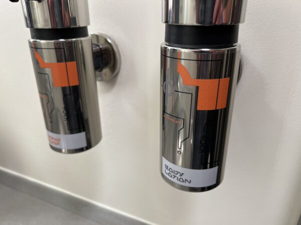 Spacey-looking dispensers for bathroom essentials like lotion.
