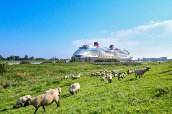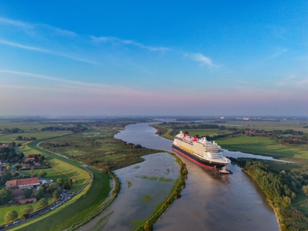 Getting a ship ready to launch is a complicated process that involves completing many milestones. This week, the Disney Treasure successfully completed an important milestone when it entered open water for the first time as it was taken down the Ems River in Europe by a tugboat from the Meyer Werft shipyard.